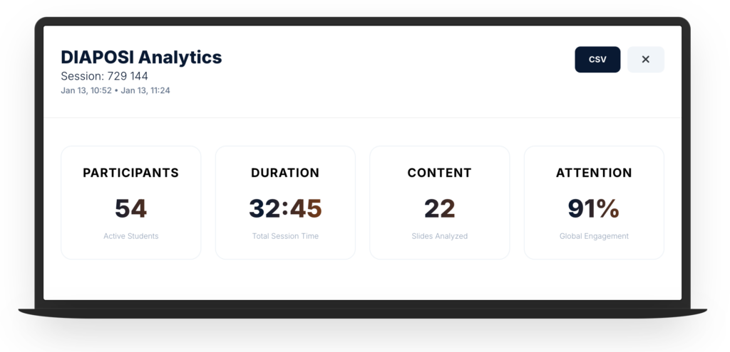 With all the data gathered in the session, these two comprehensive tables that serve as the ultimate “Audit Log” for the performance. The Slides Performance Table acts as a content diagnostic, allowing us to conclude which specific slides captured the most human-seconds of attention and where the “Sync Gap” occurred between your speech and their focus. Simultaneously, the Student Activity Table allows us to conclude the individual engagement levels of the audience, transforming anonymous student into clear behavioral profiles that distinguish between students who followed your lead and those who explored independently